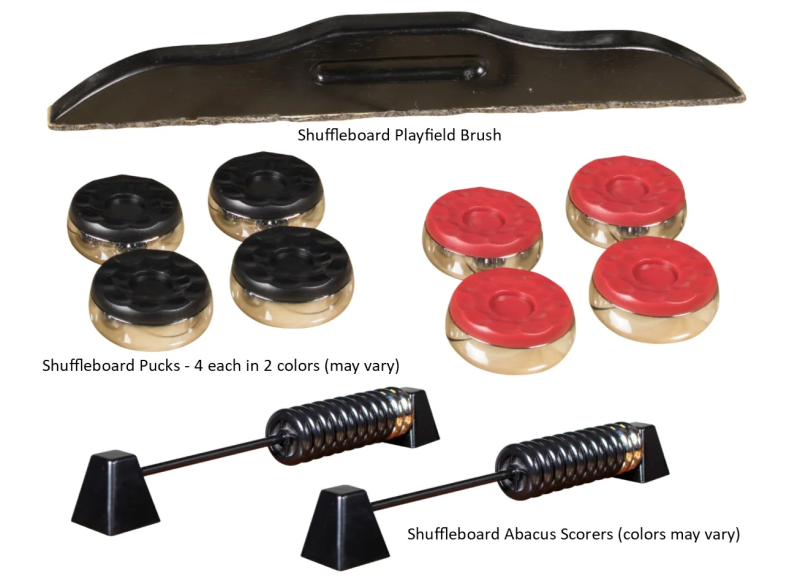 It comes with four red and four black pucks, abacus scorer, table brush, wax, and a draped cover.