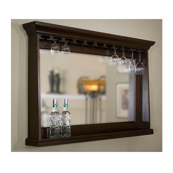 Create a true pub feel with a back bar mirror that displays your favorite bottes on the shelf and your fancy stemware on the overhead rack.