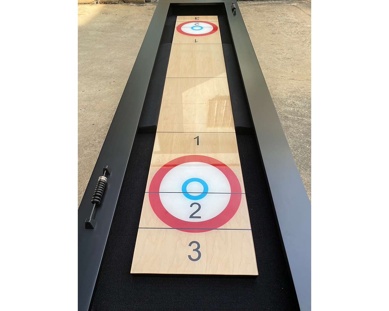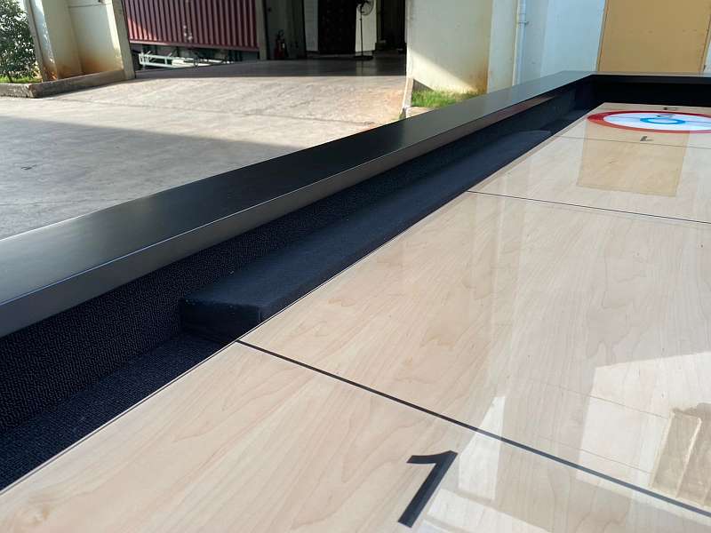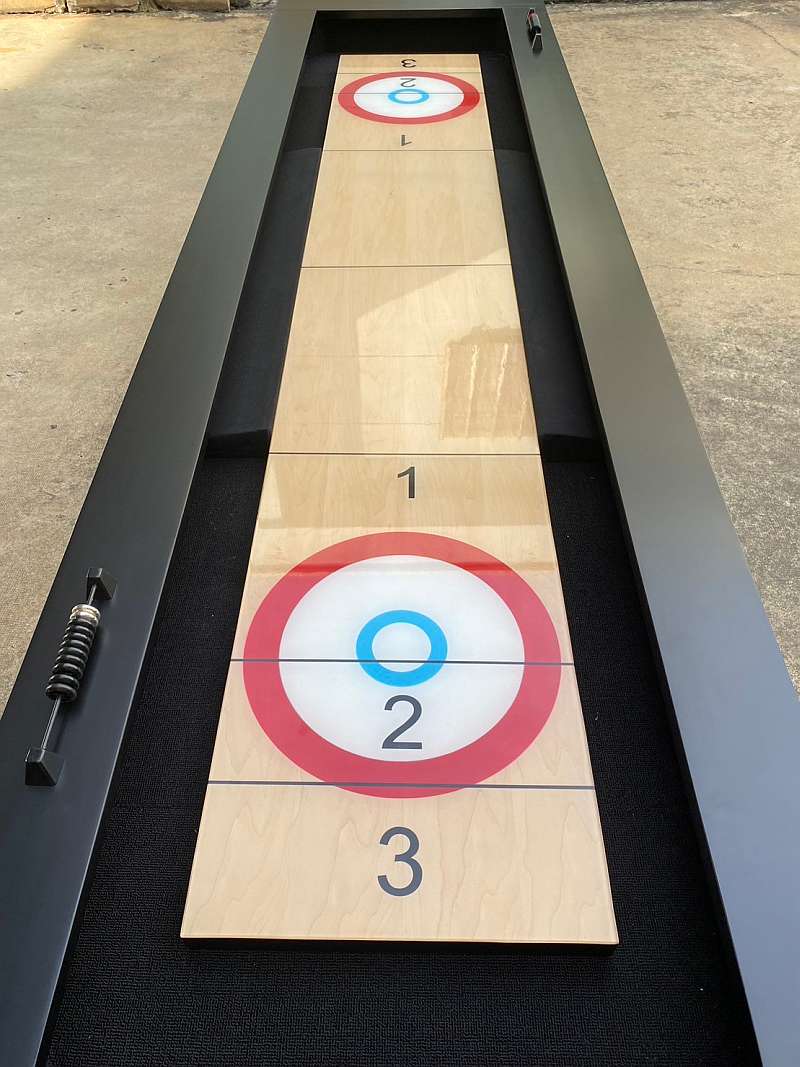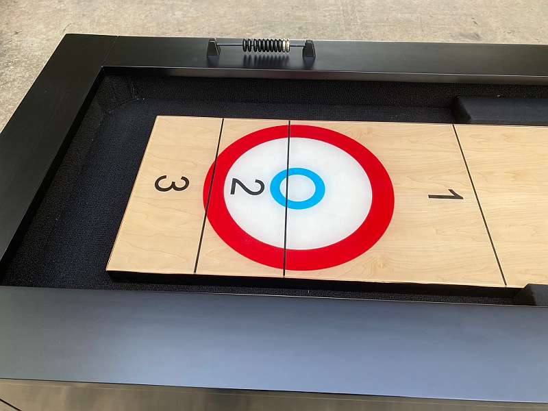 Available in 9′ or 12′, this wood cabinet Shuffleboard features a 1.5″ x 16″ playfield with a solid wood play surface, with climatic adjusters, and protected by 1/8″polymer resin coating, making it nearly indestructible, with faster play, and a leading warranty. Play straight, bank board, or curling.