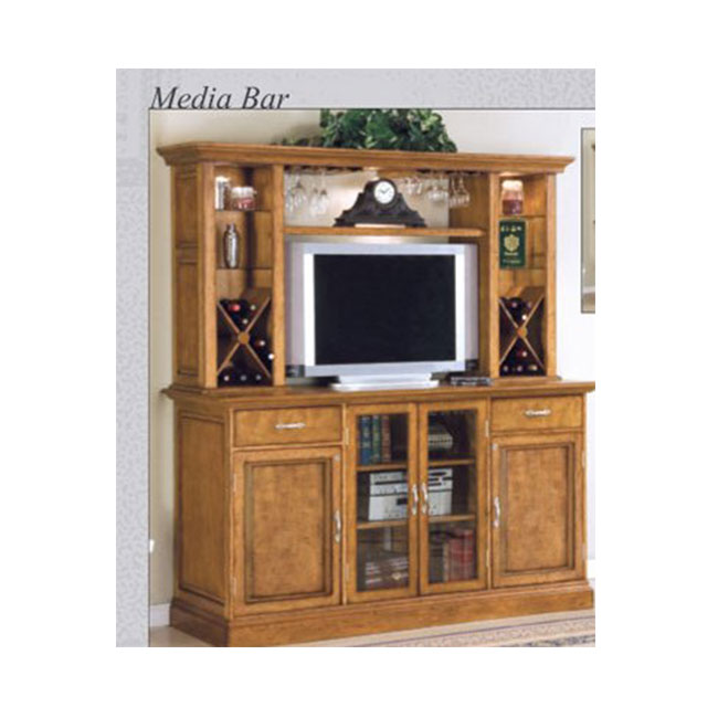 Make a statement in your entertainment room with this impressive media bar. At 6 1/2 feet long and 7 feet tall, this beautiful piece can accommodate all your bar and entertainment needs. A lit canopy displays the versatility of this piece as a cabinet in the theatre room, as a back bar in the game room or a beautiful stand alone piece of furniture. The hutch accommodates up to a 42″ flat screen, has wine racks and glass display shelving. The lower cabinet is versatile with its adjustable shelves,interchangeable glass or wood insert doors, fridge pocket and ample storage for all your stereo components or bar stock .